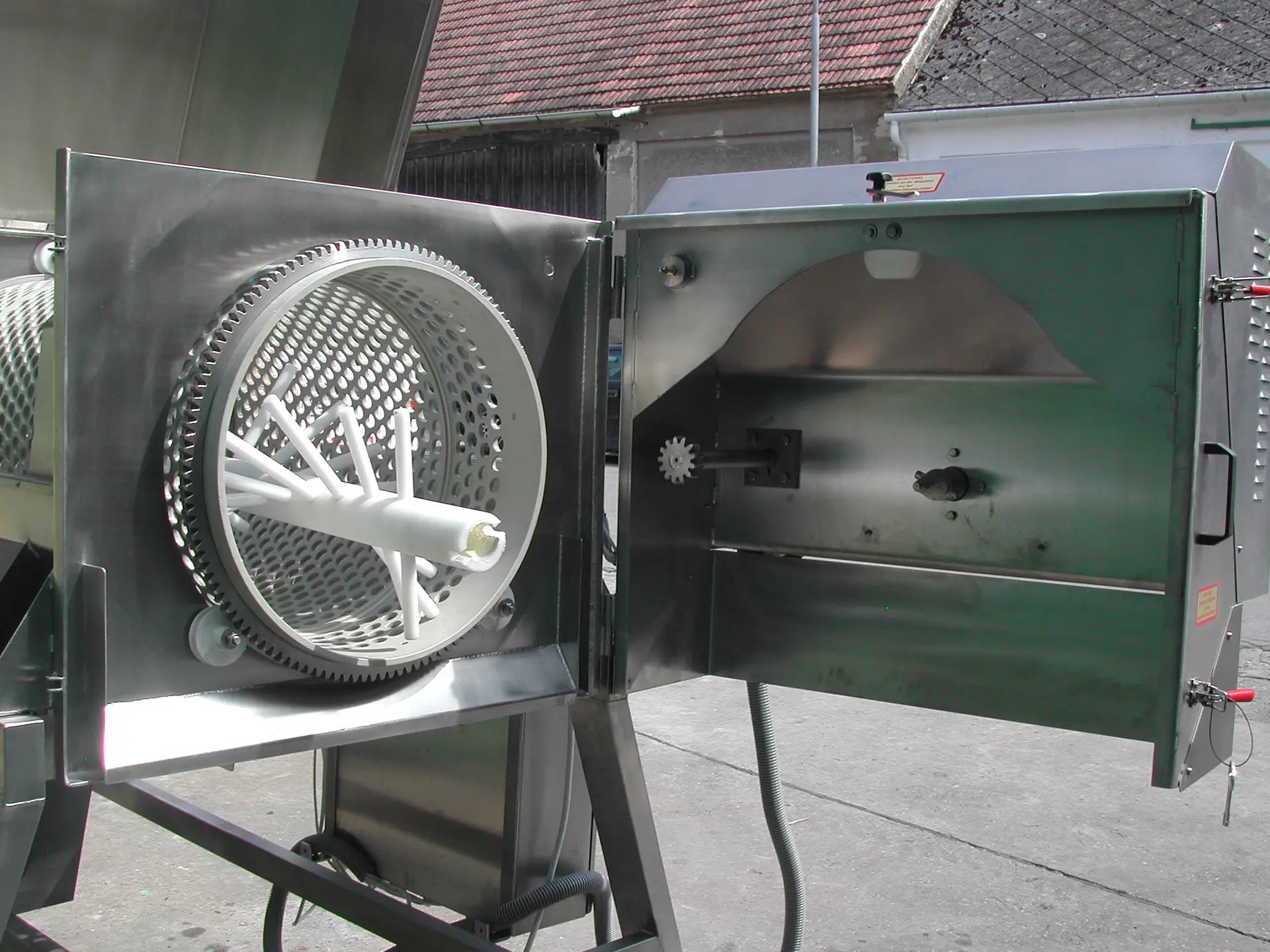 Im Bild erkennbar: Walzen mit Kleeblatt-Querschnitt für das Quetschen der Trauben